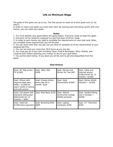 Living On Minimum Wage Worksheets & Teaching Resources | TpT 3. $10.00. PDF. Engage your students with this five day math lesson plan about making minimum wage in the United States!For just the cost of working one hour at minimum wage (depending on your state) you'll have a week's worth of engaging lesson plans to contextualize linear functions and what they actually MEAN fo.